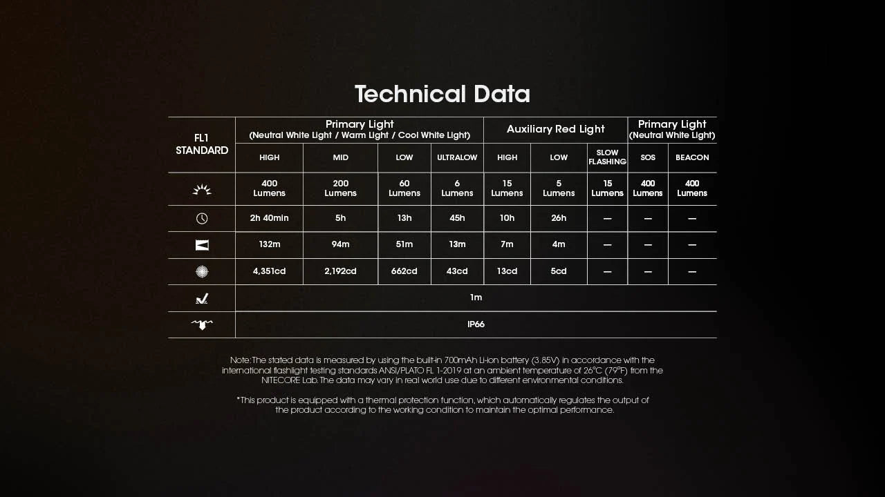 Primary Light (Neutral White Light, Warm Light, Cool White Light):| MODE | OUTPUT | RUNTIME |